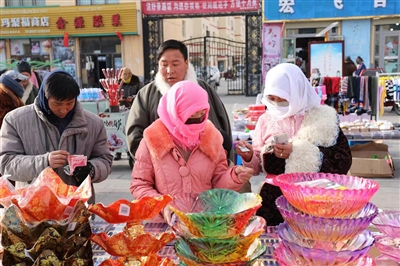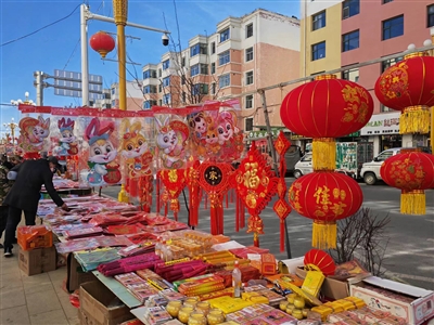 “便宜卖了、便宜卖了……”摊主老刘正忙着给顾客递大红灯笼和兔年贴画。
