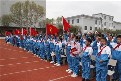 近日,海北州海晏县祁连山小学举行新队员入队仪式暨优秀学生表彰大会,144名一年级学生光荣地加入中国少年先锋队,佩戴上红领巾。 才项什姐 摄
