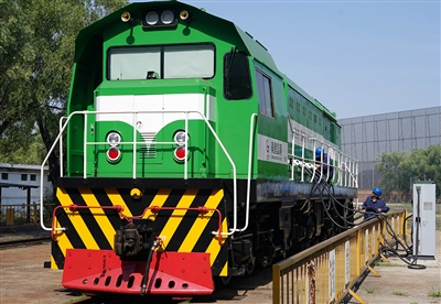 7月6日,在秦皇岛港港区内,工人在给秦皇岛港新能源1号机车充电。