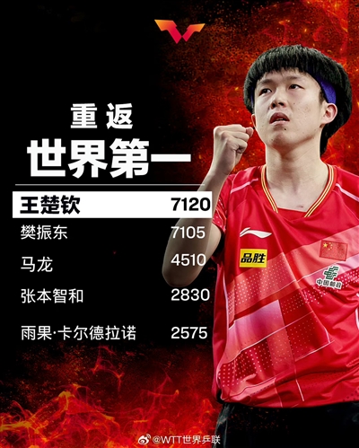 在本期排名中,王楚钦重返男单世界第一的宝座最受关注。近期王楚钦成为男乒最亮眼的球员,正值巅峰状态。在杭州亚运会乒乓球男单决赛中,他以4∶3战胜队友樊振东,首夺亚运会男单冠军的同时也成为本届亚运会“四冠王”。马不停蹄来到WTT球星挑战赛,王楚钦依旧延续了自己的火热状态, 在男单决赛中,他苦战六局,以4∶2战胜马龙,勇夺冠军。对此,王楚钦说道:“谢谢杭州和兰州的所有相遇,神奇的一段旅程,永记在心。”