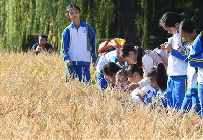 10月27日,来自中国农业科学院附属小学的学生在圆明园“多稼如云”景区的稻田边观察稻谷。