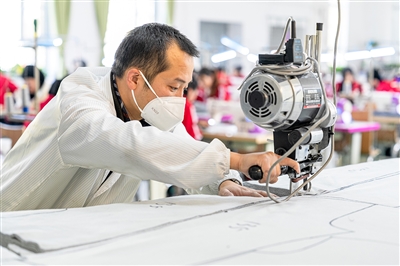 循着声音走进加工车间,宽敞明亮、干净整洁,“产业振兴乡村”的大字十分显眼。一头是裁剪师傅根据布料画皮进行裁剪,一头是身着统一工服的村民熟练地操作缝纫机,有条不紊地缝制布料,开袋、锁边、缝拉链……流水线作业下,一块块布料经过她们的双手,在缝纫机和指尖来回飞舞,一条裤子渐渐成型。
