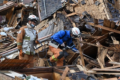1月4日,在日本石川县轮岛市,搜救人员在作业。