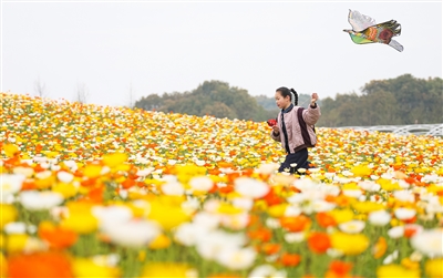 4月6日,一名小朋友在江苏镇江句容市白兔镇龙山湖村一处花海放风筝。新华社发(钟学满摄)
