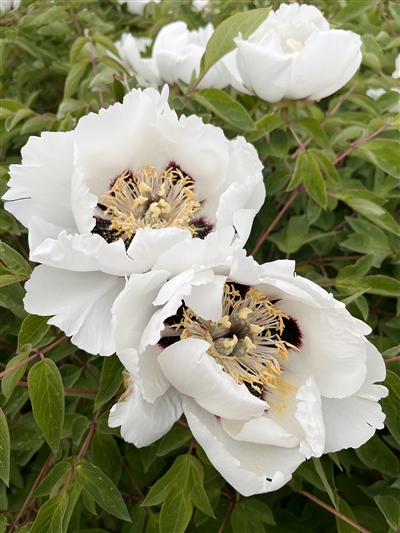 在青海最常见的就是紫斑牡丹(青海人也叫干柴牡丹),紫斑牡丹特点明显,很容易辨别,它的花瓣基部有紫斑,花大色美,花梗长且挺直,不同品种之间花瓣基部的紫斑又略有差异。花量大,高出于树丛,很少有藏花,而且多数紫斑牡丹都有香味。
