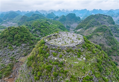 在贵州省兴义市敬南镇拢岸村附近有一处名为卢家营的村寨。据了解,在清代咸丰至同治年间,村寨旁的一座山头自然崩塌后形成一大块平面,村民们利用该平面在山顶修建防御设施抵御贼寇。如今,防御设施仅剩下部分防御营墙,留下的山头平整如刀切,宛若“消失”的山峰,令人称奇。