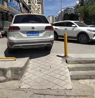 近日,记者在城北区朝阳西路西侧一停车场内看到,一辆车号为青AE757Y的轿车乱停乱放,挡住了无障碍通道处,影响市民通行,希望相关部门加强管理。俪臻摄