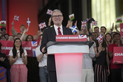当地时间7月5日,根据计票结果,执政党保守党遭遇滑铁卢,反对党工党在议会下院选举中赢得超过半数席位,获得选举胜利。当天,工党领袖基尔·斯塔默正式就任英国首相,这是英国在8年间迎来的第六任首相。
