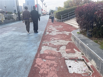 近日,记者在五四西路青海大剧院南侧看到,人行道旁铺设的自行车道塑胶层大面积破损、脱落,地面坑洼不平,不仅影响市容还给大家骑行带来存在安全隐患,希望有关部门可以及时修复。 毓洛 摄