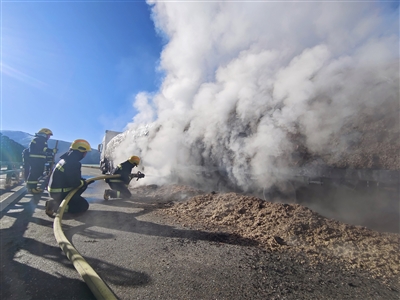 据了解,当日9时32分,救援人员接到报警到达现场后发现,一辆运输棉籽壳的半挂车后侧轮胎正处于猛烈燃烧状态,现场浓烟滚滚。救援人员立即对起火车辆进行扑救,经过23分钟的努力,大火被成功扑灭。据悉,事故车辆是从新疆运载30余吨棉籽壳前往四川,在行驶至该路段时,司机通过后视镜发现车辆右后侧轮胎冒烟,便立即下车进行查看处理,并拨打了119报警。