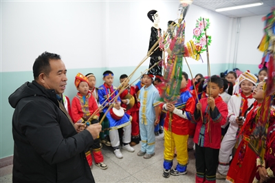 “两个黄鹂鸣翠柳,一行白鹭上青天。窗含西岭千秋雪,门泊东吴万里船。”这是皮影戏阳腔唱段的部分内容,唱词里既有古诗,也有用讲述的方式再现孩子们读书写字的画面。记者现场感受到,在锣、鼓、棒子、嚓等乐器的配合下,这段唱词高低有致、长短不一、韵味十足。李彩亭告诉记者:“你听,这段唱词是学生熟悉的古诗《绝句》,因为对唱词熟悉,孩子们练习了三四次就十分流畅了。”李彩亭还介绍说,在编辑这些唱词时,他会十分注意唱词的韵脚和长短,不仅要唱出皮影戏的韵味,而且让学生对词熟能生巧,让一出出皮影戏唱出新味道。