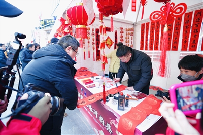 现场还设立了14个特色商品展位,其中河南县绿色有机农畜产品及文博文创产品展位4个,展示了河南县独特的地域特色和文化魅力。西宁市“青海老八盘”年夜饭套餐、手工银铜暖锅、玉拉草莓、非遗剪纸等精品年货展位10个,让人们在品尝美食的同时,还能选购到心仪的年货。尤其是春联展位,市美术馆的专业老师现场挥毫泼墨,为市民朋友书写并赠送春联。