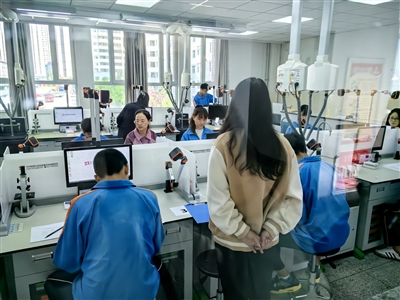 当天,学校正在进行2025年初中学业水平实验操作考试,透过玻璃,生物实验操作考试教室内,学生们有条不紊按照抽到的题目进行生物实验操作。最新的实验仪器和创新教学为学生们的日常学习和考试增添了信心。
