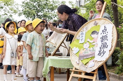 5月30日,老师在江苏省泰州市海陵区秋雪湖幼儿园给小朋友额头上点朱砂。