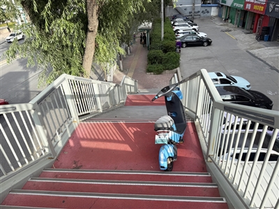 近日,记者在柴达木路万科公园里公交车站旁过街天桥看到,一辆共享电动车竟停放在天桥南侧的台阶上,此行为不仅影响通行还存在安全隐患,希望广大交通参与者文明停放,共同维护交通秩序。毓洛 摄