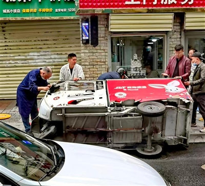 9月27日10:50,一位快递小哥开着快递车经过微波巷时,因行驶速度较快车辆不慎撞上道牙石发生侧翻,快递小哥被困在车内。路过的5名群众见此情况后赶紧上前将车抬起来,并将快递小哥从驾驶位搀扶出来。快递小哥当场对大家的热情帮助表示感谢。乐于助人是中华民族的传统美德,让我们为乐于助人的热心群众点赞。微友 老王 摄