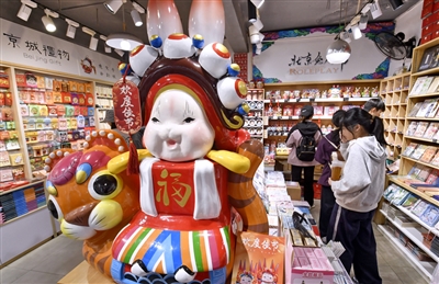 10月6日,游客在北京烟袋斜街的商店里选购北京兔儿爷文创产品。