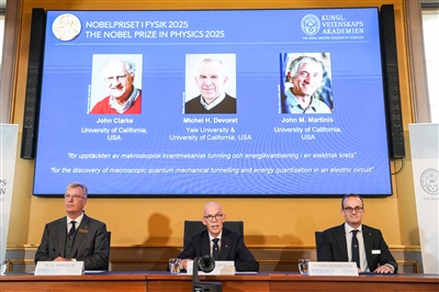 在量子力学诞生百年之际,瑞典皇家科学院10月7日宣布,将2025年诺贝尔物理学奖授予约翰·克拉克、米歇尔·H·德沃雷和约翰·M·马蒂尼斯三名量子物理学家,以表彰他们在电路中实现宏观量子力学隧穿效应和能量量子化方面的贡献。