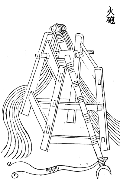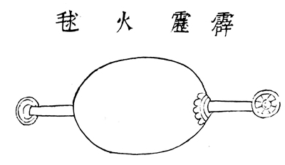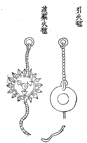 《武经总要》记载了蒺藜火球、霹雳火球等火器。蒺藜火球中有一个带有三根支叉、六个尖刺的铁制刃片,用火药将它裹成一个球体,中间贯穿一根长一丈二尺的麻绳。球体外再用纸和其他的药料混合涂敷包裹并安装了八枚带有倒钩铁蒺藜。如果敌军来攻城,都可以用抛石机将它们发射出去。