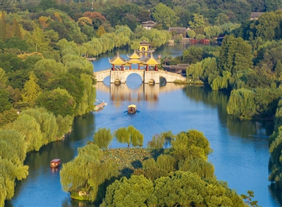 10月9日,游客在江苏扬州瘦西湖风景区游玩赏秋(无人机照片)。