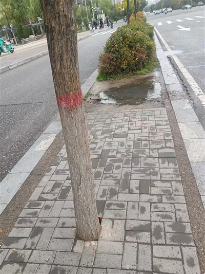 近日,有市民反映,昆仑大道北侧省残联公交车站附近相关部门铺设地砖时没有给行道树预留树坑,长期下去树木会因无法吸收水分而死亡,希望有关部门能够及时处理,确保树木健康生长。微友 秋风吹我心 摄