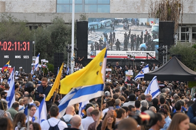 10月13日,在以色列特拉维夫,人们通过大屏幕观看被扣押人员释放直播。