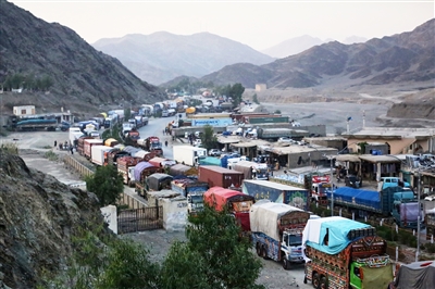 这是10月14日在阿富汗楠格哈尔省拍摄的发生交火后滞留在边境地区的货车。