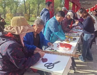 近日,西宁火车西站社区组织辖区老人开展重阳徒步行活动,活动中,老人们围坐在一起用各种落叶创作形态各异的手工艺品,亲近自然的同时也锻炼了身心。俪臻 摄