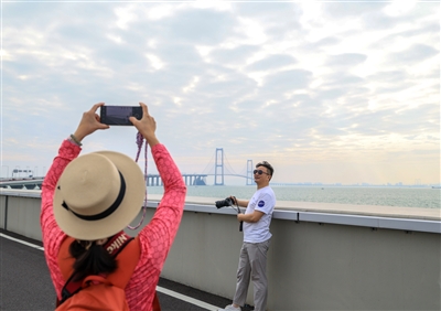 10月25日,深中通道西人工岛开启文旅试运营,首批约百位媒体记者和游客抵达西人工岛体验超级工程文旅之行。深中通道全长约24公里,集“桥、岛、隧、水下互通”于一体,2024年6月30日正式通车。 新华社记者 毛思倩 摄