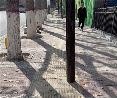 10月27日,记者来到明杏路西侧,看到人行道上的2处地砖凸起,与路面形成约3厘米的高差,20余处人行道地砖破损或缺失,砂石裸露。一路人告诉记者,这条人行道上的部分地砖松动,下雨积水后不小心踩在上面就会溅起泥水。这段人行道经过一单位大门,大门两侧有围墙,人行道铺设至围墙附近就开始变窄,盲道随之直接拐到了车行道上,盲道上还有3个木质电线杆……