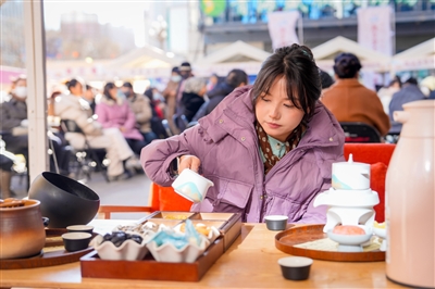 高原茶餐区集中呈现河湟饮食文化的精髓。非遗“老八盘”传承人现场搭灶烹制,依古法流水上菜,市民可即做即尝,感受“老八盘配热茯茶”的地道风味;传统大锅熬制的河湟熬饭香气扑鼻,参与互动的群众均可免费品尝一碗热饭与花卷,通关者更获赠特色美食礼包;同时,现场还持续熬煮青海特色熬茶、罐罐茶,茶香氤氲,暖身更暖心。