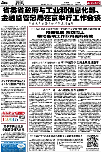 本报讯(记者 施翔)12月9日,省委常委、市委书记王卫东赴大通县宣讲党的二十届四中全会精神,贯彻落实省委十四届十次全会部署,调研督导“三张清单”推进情况并主持召开座谈会。他强调,要以“十四五”收官和“十五五”开局为契机,抢抓机遇、乘势而上,推动各项工作取得更好成效。